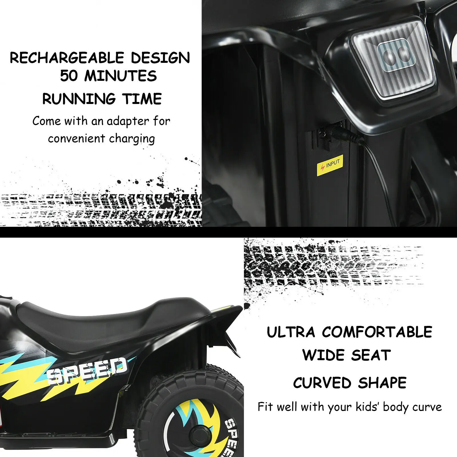 Let your little kids enjoy their spare time to drive this cool electric quad ATV and have enjoyable childhood memory. It takes your children less time to learn to ride on this car. Meanwhile, the battery powered vehicle can move in forward or reverse direction, at the safety speed range from 1.7 mph to 2.85 mph. Its rechargeable design also endows longer running time to allow kids experience infinite driving fun. Moreover, children can drive either indoors or outdoors. The wear-resistant wheels made from high quality material offers high abrasion resistance, capable of riding on different kinds of ground, such as wood, cement and more. Additionally, it takes the driving comfortableness into consideration as well. Therefore, the quad ATV is designed with comfortable seat to fit perfectly with kids’ body shape.