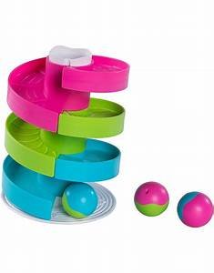 Three uniquely textured tracks slide onto the tower in any order you want. Drop one of the balls onto the top and send it rolling with a light clatter.