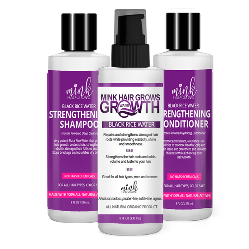 Instructions: Apply a generous amount of Miracle Mink Hair Growth Black Rice Water Shampoo to your hair. Thoroughly rinse out your shampoo and wring out your hair. Apply a generous amount of Miracle Mink Hair Black Rice Water. Place a conditioning cap on your head for 20 minutes to set the Black Rice Water. Rinse out the Black Rice Water, deep condition your hair with the Miracle Mink Black Rice Water Conditioner. Set for 15 minutes under a heated cap. Rinse, dry and style as desired. To maximize your growth, use the Miracle Mink Hair Day & Night Hair Growth Serum.